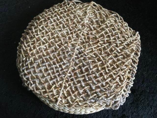 Het monnikenwerk van twee weken geleden heeft geresulteerd in een mooie dikke bol nieuw gewikkeld garen, groot genoeg om een sprang mee op te zetten. Dat heb ik inmiddels gedaan en de sprang is ook alweer afgewerkt, want met zulk dik garen is het sprangen snel gedaan. De sprang is precies groot genoeg om de bodem van het nest te bedekken. Maar daarmee ben ik er nog niet, want ik wil ook de randen nog omkleden. Dat is nu mijn volgende project.