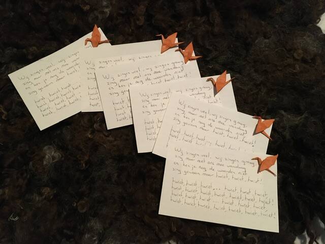 Vlak van tevoren had ik bedacht dat het leuk zou zijn als de kinderen een beetje mee zouden kunnen doen. Ik maakte daarom kaartjes met een van de liedjes van het sprookje. Door mee te zingen zouden de kinderen het bange vogeltje kunnen helpen om een beetje vrolijker te worden.