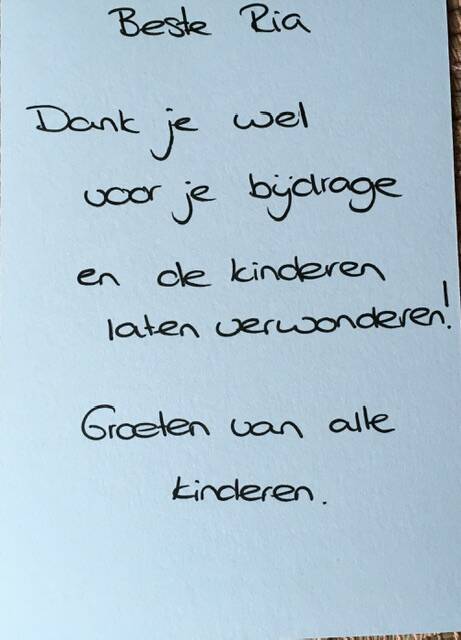Een van de kinderen mocht mij een cadeautje overhandigen. Ik kreeg een prachtig prentenboek met een heel mooi verhaal: 'De Veer van de Vuurvogel'. Het is een verhaal dat prachtig aansluit bij mijn eigen verhaal. Ik ben dan ook erg blij met dit boek, dat met zoveel zorg voor mij is uitgezocht.