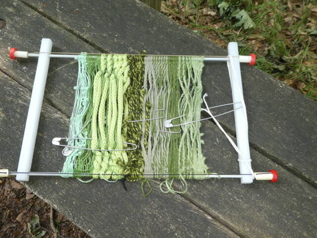 Ik gebruik voor deze gelegenheden een kleiner frame, dat precies in mijn fietstas past. Door ervaring weet ik dat de breinaalden tijdens het transport los kunnen raken van het frame. Om dat te voorkomen gebruik ik van die ouderwetse ‘paddenstoeltjes aan een elastiekje’, die je kunt gebruiken om een breiwerkje veilig weg te leggen.