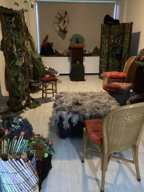 Het bange vogeltje zit al klaar en ik heb ook al wat extra stoelen en krukjes neergezet, want voor aanstaande zondagmiddag staat er nog een vertelvoorstelling gepland.