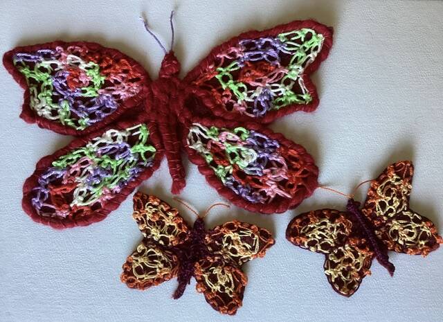 De gehaakte delen van de vlinders worden vastgezet op een ondergrond van vilt. Er is vilt aanwezig in vele kleuren. Er zijn ook diverse garens aanwezig, maar als je vlinders een speciale kleur moeten hebben, neem dan je eigen garen mee.