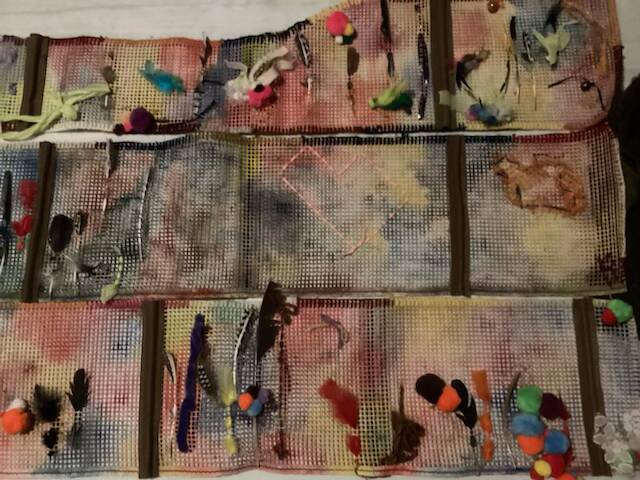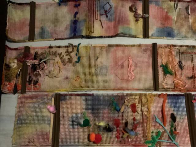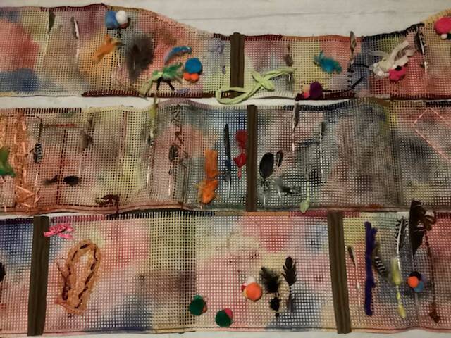 We gingen aan de slag met een heleboel mooie materialen, zoals veren, linten en garens om het nest te versieren. Ieder kind deed dat op zijn of haar eigen manier. Grotere kinderen gingen bijvoorbeeld met de garens borduren, terwijl kleinere kinderen allerlei materialen door het stramien probeerden te weven of er aan vast te knopen.