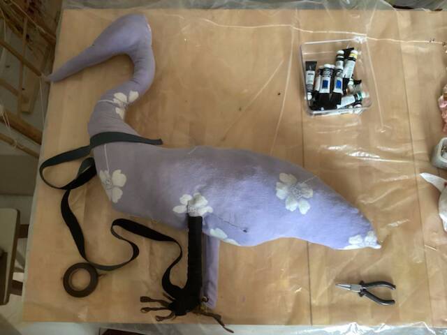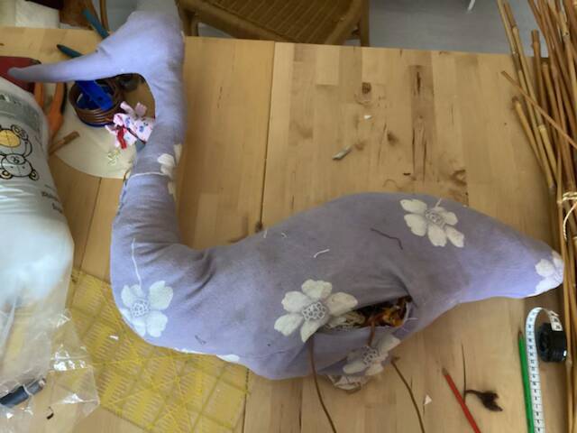 Ik maakte hiervoor op een grote rol papier een schets op ware grootte. Deze knipte ik met zoom uit van dubbele stof van een oud laken. Voor de onderbuik knipte ik nog een extra stuk stof, om het model erin te krijgen.