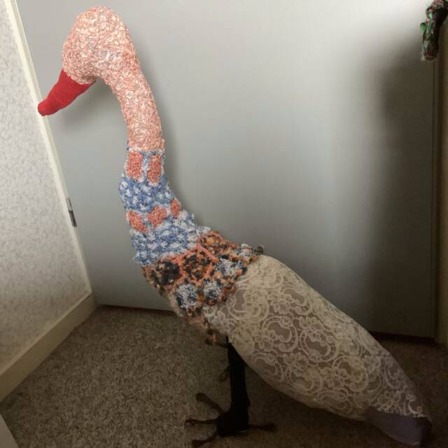 Daarna was het tijd om een frame te maken van metaaldraad. Dat frame is absoluut nodig om de lange hals rechtop te kunnen laten staan en de vogel mooi in model te houden. Voor het maken van het frame kreeg ik hulp van Jan. Toen het frame erin zat kon de vogel worden opgevuld met kleine stukjes stof, draadjes en fiberfill. Nu werd het tijd om poten te maken. Om de poten voldoende stevigheid te geven gebruikten we stokjes en metaaldraad. Aan de uiteinden van het metaaldraad (electriciteitdraad) vormde ik de tenen. Het was wel even zoeken om de juiste balans te vinden voor de vogel, zodat hij stevig zou kunnen staan. In deze fase kwam ook Ingrid nog even helpen. Uiteindelijk kon de vogel staan en was er een basis om verder op te werken.