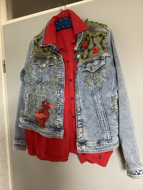 Ik heb voor dit jasje uitsluitend materialen uit mijn voorraad gebruikt: oude kapotte sjaaltjes, wat kant, een eco fruitnetje, gehaakte bloemetjes en bloemknoppen die ik al eens eerder had gemaakt, enkele kralen voor de ogen van de vogels en wat groene haakkatoen voor de blaadjesslingers die ik heb gehaakt.