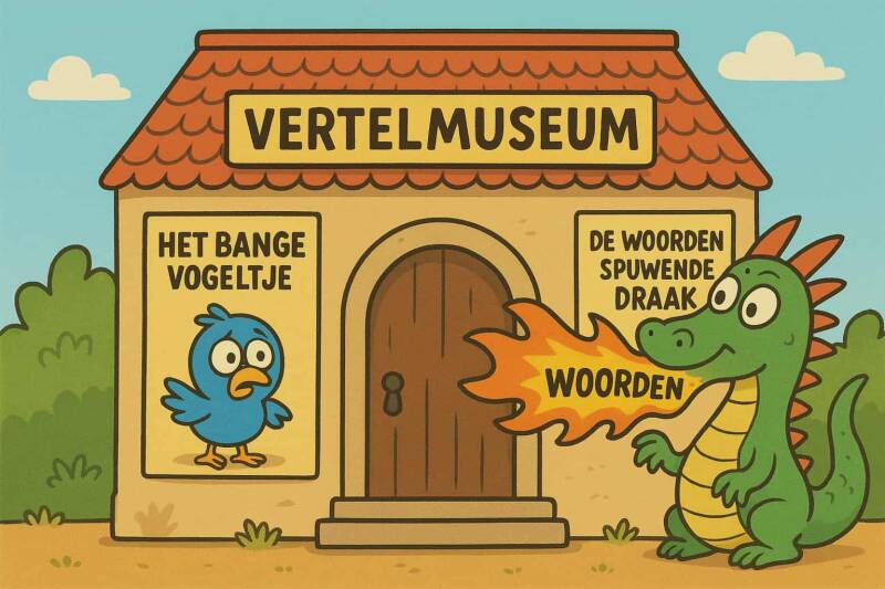 Wat was het leuk: Verhalenavond. Als 'dank voor het mooie verhaal' maakte Stefan de Heij voor mij dit leuke plaatje van het Vertelmuseum met het bange vogeltje en de giftige woorden spuwende draak.